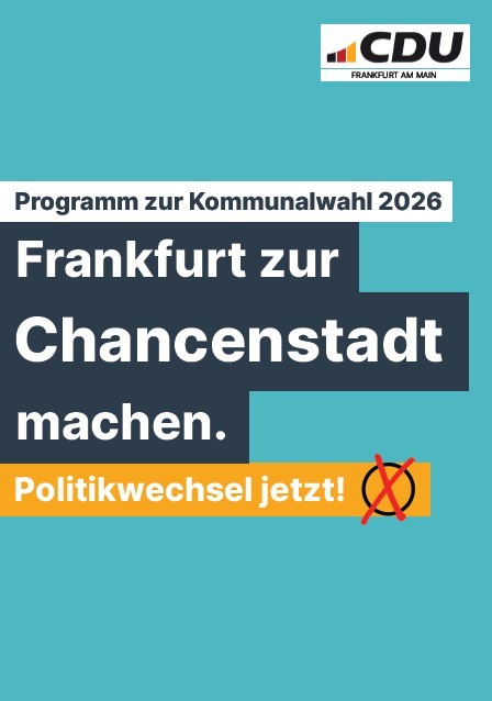 Am 15. März 2026 entscheiden die Frankfurterinnen und Frankfurter über die Zukunft ihrer Stadt. Mit unserem Programm wollen wir einen echten Politikwechsel einleiten und Frankfurt zu einer Stadt der Chancen machen – für alle Menschen, die hier leben. Unser umfassendes Wahlprogramm setzt klare Schwerpunkte in den Bereichen Sicherheit, Bildung, Mobilität, Wohnraum, Digitalisierung und gesellschaftlicher Zusammenhalt. Hier können Sie das vollständige Programm als PDF herunterladen: